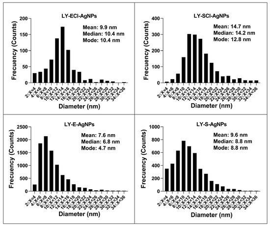 The distribution of the AgNPs’ core sizes was different depending on the type of AgNPs (Figure 9, Table 2), and their average diameter ranged from 7.5 to 9.9 nm for all AgNPs except for LY-SCl-AgNPs, which had a larger average diameter of 14.7 nm. The AgNPs from media with NaCl showed a larger average diameter than those without this salt. Additionally, the AgNPs from stationary phase cultures were bigger than their counterparts from exponential phase cultures, especially those produced from chlorine-containing media. Similarly, the polydispersity indices were below 0.40 for most AgNPs, indicating a moderate size dispersity [90,91], although the LY-E-AgNPs presented a higher dispersity (PDI = 0.50). Similar correlations were observed for the AgNPs from P. alloputida [56] and Parachlorella [55] obtained in previous studies.