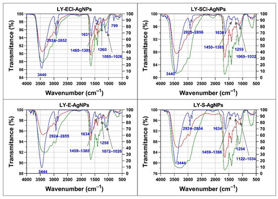 FTIR analysis of the AgNPs’ organic composition and broths. In blue, AgNPs’ spectra; in green, broths before synthesis; in red, broths after synthesis. The wavenumbers of the principal AgNPs’ bands are indicated.