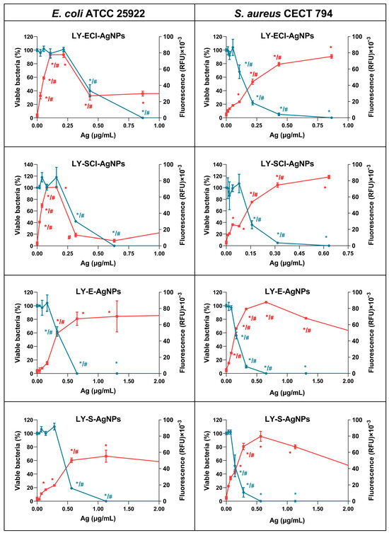 The accumulation of the reactive oxygen species (ROS) by E. coli ATCC 25922 and S. aureus CECT 794 after a 4 h treatment with the AgNPs at 37 °C was evaluated by using the 2′-7′-dichlorodihydrofluorescein diacetate (Sigma-Aldrich, Co., St. Louis, MO, USA) (DCFH-DA) method following the protocols used by other authors [39] and us in previous studies [55,56]. The bacteria-killing activity was determined by colony counting of the remaining viable cells after the 4 h treatment, as in our previous work [55]. Briefly, 7.5 × 107 CFUs/mL of the control bacteria in phosphate saline solution (PBS) were incubated in the presence of 5 µM DCFH-DA and increasing AgNP concentrations. Thereafter, the generated fluorescence was measured in a FLUOStar® Omega plate reader using 485/520 nm for excitation/emission. After the fluorescence measurements, the AgNPs’ killing effect under these conditions was determined by counting the CFUs/mL obtained after plating 50 µL of 1/20,000 dilutions of the samples in nutritive agar.
