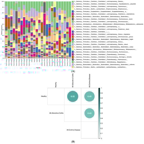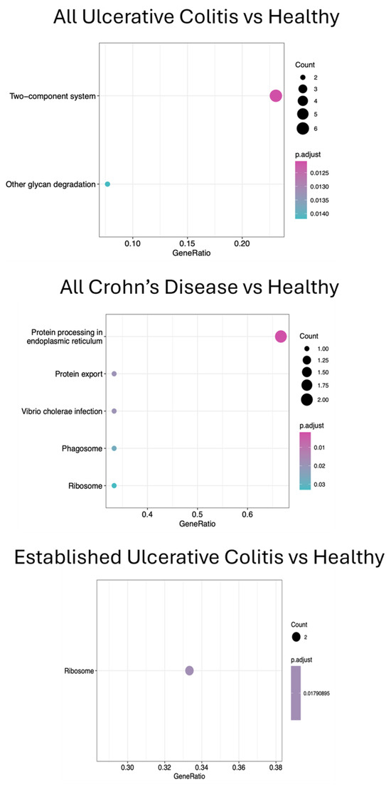 - Conrad, M.A.; Bittinger, K.; Ren, Y.; Kachelries, K.; Vales, J.; Li, H.; Wu, G.D.; Bushman, F.D.; Devoto, M.; Baldassano, R.N.; et al. The intestinal microbiome of inflammatory bowel disease across the pediatric age range. Gut Microbes 2024, 16, 2317932. [Google Scholar] [CrossRef]
