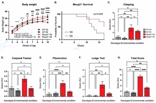 Figure 1. Permanent exposure to an enriched environment (EE) since weaning attenuates the RTT-like phenotype in mice. (A) Body weight recordings of WT mice exposed to an enriched environment (EE) or standard cages (SC), and Mecp2-/y mice exposed to SC or EE. Mecp2-/y mice exposed to EE showed a decrease in body weight in comparison with Mecp2-/y mice housed in control conditions. (B) Lifespan of Mecp2-/y mice exposed to SC or EE. The decreased lifespan of Mecp2-/y mice is extended by exposure to EE. (CG) Overall phenotypic evaluation of Mecp2-/y mice: (C) the increased level of clasping shown by Mecp2-/y mice was not prevented by exposing mice to EE. The increased levels of corporal tremor (D), piloerection (E), and hind-limb discoordination (F) shown by Mecp2-/y mice were prevented by exposure to EE. (G) General state evaluation of mice by a total score, which was higher in Mecp2-/y mice in SC compared to WT, and diminished by exposure to EE in Mecp2-/y mice. WT n = 33; Mecp2-/y n = 10–16 biologically independent animals. Data are presented as mean ± SEM values, and differences were analyzed by (B) Simple survival analysis Mantel–Cox test, followed by Wilcoxon test, and (A,CG) two-way ANOVA, followed by Tukey’s multiple comparisons tests. The levels of significance are shown as * p < 0.05; ** p, ++ p, or ## p < 0.01; +++ p, ### p, or *** p < 0.001; **** p, ++++ p, or #### p < 0.0001; ns, non-statistical differences.