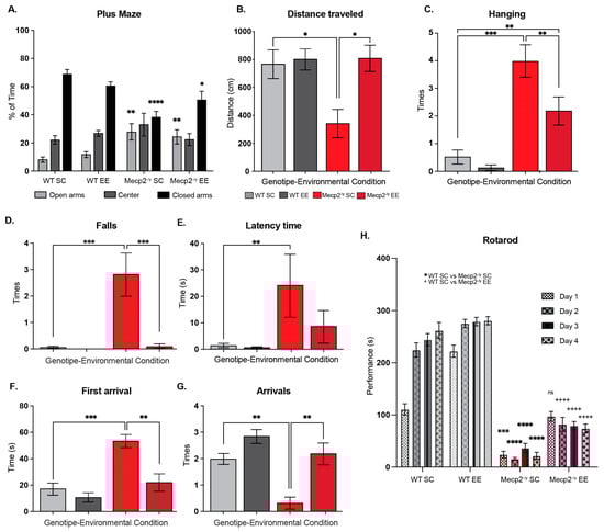The next step was to evaluate whether exposure to EE could attenuate the behavioral phenotype of the RTT mouse model. Mecp2-/y mice and their WT littermates were evaluated using a second battery of phenotypic evaluations to assess anxiety-like behavior, spatial perception, locomotion, and motor coordination performance. First, mice were evaluated in the elevated plus maze. As expected, WT mice showed a marked preference for staying in the closed arms of the maze. As previously demonstrated [43], Mecp2-/y mice exposed to SC showed a higher preference for open arms and, on the contrary, less preference for closed arms, with no preference for any of the arms. EE exposure did not affect the arm preference in WT mice; however, in Mecp2-/y mice, EE reestablished the preference for closed arms (Figure 2A). Mice were then evaluated in the open field test. We measured traveled distance as a locomotion parameter. Mecp2-/y mice exposed to SC showed significantly less locomotion activity than WT mice exposed to SC and EE. However, Mecp2-/y mice exposed to EE showed increased locomotor activity compared to Mecp2-/y mice exposed to SC (Figure 2B). Thus, EE exposure improved locomotion in an RTT mouse model.