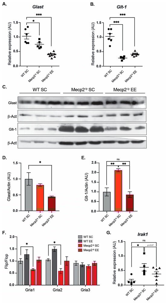 Figure 4. Exposure to a neuronal plasticity-dependent paradigm can partially reestablish expression levels of genes related to cellular homeostasis. mRNA expression of Glast (A) and Glt-1 (B) by RT-qPCR in WT mice exposed to SC, and Mecp2-/y mice exposed to SC or EE. EE exposure failed to reestablish Glast and Glt-1 expression levels in Mecp2-/y mice. (C,D) Glast protein levels are similar in Mecp2-/y mice housed in SC and WT mice and decreased in Mecp2-/y mice exposed to EE. (CE) Glt-1 protein levels are increased in Mecp2-/y mice housed in SC compared to WT mice; EE exposure reestablishes Glt-1 protein levels in Mecp2-/y mice. (F) RT-qPCR of flip and flop splicing variants of Gria1, Gria2, and Gria3 genes shows that EE exposure restores the flip/flop ratio of Gria1 and Gria2 in Mecp2-/y mice. (G) mRNA expression of Irak1 by RT-qPCR; EE exposure reduced Irak1 expression in Mecp2-/y mice to levels similar to WT mice. WT n = 3–8; Mecp2-/y n = 3–8 biologically independent animals. Data are presented as mean ± SEM values, and differences were analyzed by (A,B,D,E,G) one-way ANOVA followed by Tukey’s multiple comparisons tests or (F) two-way ANOVA followed by Tukey’s multiple comparisons tests. The levels of significance are shown as * p < 0.05, ** p < 0.01 and *** p < 0.001; ns, non-statistical differences.