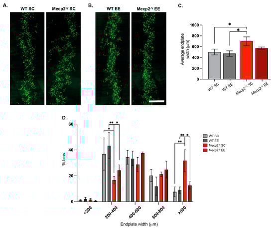 Figure 5. Exposure to a neuronal plasticity-dependent paradigm ameliorates the alterations in neuromuscular junction distribution exhibited by an RTT mouse model. (A,B) Representative images of endplate distribution in the respiratory diaphragm muscle from WT and Mecp2-/y mice exposed to SC (A) or EE (B). (C) Mecp2-/y mice exposed to SC had increased average endplate width phenotype, which was not observed in Mecp2-/y mice exposed to an enriched environment. (D) Histogram distribution of different endplate width ranges shows that the relative abundance of endplates from WT mice was not affected by the housing conditions; however, in Mecp2-/y mice exposed to EE, the proportion of wider endplates (>800 μm width) was significantly reduced. WT n = 3; Mecp2-/y n = 3 biologically independent animals. Data are presented as mean ± SEM values, and differences were analyzed by (C) one-way ANOVA followed by Kruskal–Wallis’s multiple comparisons tests or (D) two-way ANOVA. The levels of significance are shown as * p < 0.05; ** p < 0.01.
