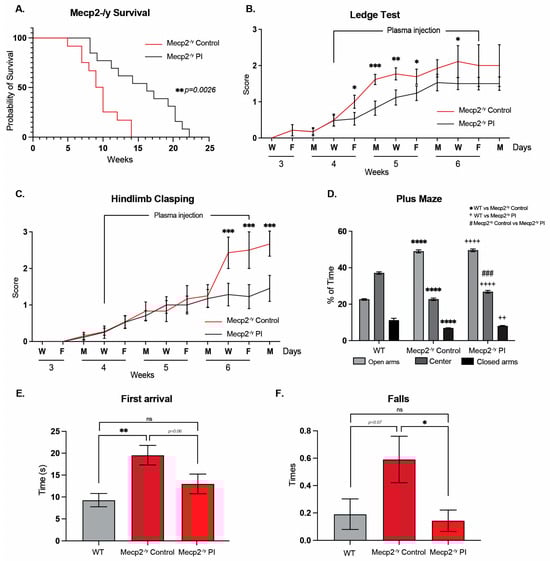 Figure 6. Treatment with plasma from young mice attenuates the RTT phenotype in a mouse model of the disease. (A) Lifespan analysis of Mecp2-/y mice with or without IP plasma injection; IP plasma injection increased the survival of Mecp2-/y mice. (B,C) Phenotypic evaluation of Mecp2-/y mice; IP plasma injection attenuated the progression of motor and neurological RTT-like symptoms, as evaluated by the (B) ledge test and (C) hindlimb clasping. (D) In the elevated plus maze, used to evaluate anxiety-like behavior, IP plasma treatment did not prevent the increased preference of Mecp2-/y mice for the open arm of the maze. (E,F) In the elevated dowel test, used to evaluate motor coordination, IP plasma treatment prevented the increased time to first arrival (E) and the increased number of falls (F) in Mecp2-/y mice. WT n = 22; Mecp2-/y n = 6–10 biologically independent animals. Data are presented as mean ± SEM values, and differences were analyzed by (A) Simple survival analysis Mantel–Cox test followed by the Wilcoxon test and (BF) two-way ANOVA followed by Tukey’s multiple comparisons tests. The levels of significance are shown as * p < 0.05; ** p or ++ p < 0.01; *** p or ### p < 0.001; and **** p or ++++ p < 0.001; ns, non-statistical differences.