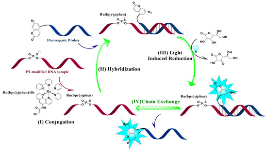 Schematic diagram of the combination of fluorogenic nucleic acid probes and OTRs in the quantification of PT modification frequency. (I) Conjugation: DNA sample was treated with Ru(bpy)2(phen)-Br. (II) Hybridization: DNA sample was treated with fluorogenic nucleic acid probes. (III) Light-induced reduction: The reduction of 7-azido-coumarin was quantified by fluorescence detection. (IV) Chain exchange: Start with new fluorogenic cycles.