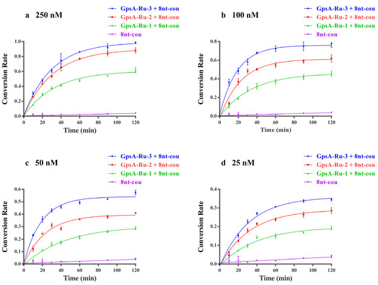 In addition to the effect of different PT modification positions, the conversion rate was also closely related to the concentration of GpsA-Ru-3, GpsA-Ru-2 and GpsA-Ru-1. As shown in Figure 2, with higher concentrations of GpsA-Ru, higher conversion rates were observed if the 8nt-cou concentration was fixed at 500 nM. To confirm the relationship between the concentration of target oligonucleotide GpsA-Ru and fluorogenic signal intensity, we compared the fluorescence readings obtained by incubating varying concentrations of GpsA-Ru-3 with the probe 8nt-cou under the same experimental conditions. To ensure the full conversion of 7-AzC to fluorescent 7-amino-coumarin, we first incubated the target GpsA-Ru-3 at a concentration of 1 μM with the probe 8nt-cou at a concentration of 500 nM for 2 h, and the maximum fluorescence intensity was obtained. The fluorescence intensity was then measured after incubating 8nt-cou with different concentrations of GpsA-Ru-3 under the same reaction conditions.