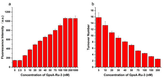As shown in Figure 3a, when the GpsA-Ru-3 concentration was 2.5 nM, the fluorescence intensity was almost equal to the background fluorescence intensity within 2 h. After increasing the GpsA-Ru-3 to 5 nM, an obvious detectable fluorescence signal was observed and the fluorescence intensity increased gradually with the higher GpsA-Ru-3 concentration. And the fluorescent signal reached a plateau at a concentration of 150 nM within 2 h, which is the same signal intensity as when GpsA-Ru-3 was overdosed at 1000 nM. This observation indicated that one GpsA-Ru-3 could catalyze the reduction of multiple 8nt-cou oligonucleotide probes. Thus, the turnover numbers for GpsA-Ru-3 at different concentrations were calculated under the same conditions, as shown in Figure 3b. The turnover number was the average number of times that each GpsA-Ru-3 could catalyze the reduction of 7-azido-coumarin of the 8nt-cou probe within 2 h. When the GpsA-Ru-3 concentration was 200 nM, the turnover number was 2.5, indicating the full conversion of 7-AzC on the 8nt-cou probe (500 nM), while when the GpsA-Ru-3 concentration was 5 nM, the turnover number was up to 16 in 2 h, which meant that a longer reaction time might be needed to fully convert 7-azido-coumarin of the 8nt-cou probe to the 7-amino-coumarin moiety. Taken together, this probe design can possibly achieve signal amplification by mediating multiple turnovers of the reduction of the 7-azido-coumarin moiety on the 8nt-cou probe.