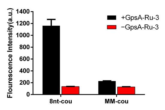 To further investigate the specificity of the target oligonucleotide sequence, we also synthesized a mutated 8nt-cou (MM-cou, Table 1) with a single mismatched nucleotide A to T. The detection performance of both MM-cou and 8nt-cou probes (500 nM) was evaluated for the target sequence GpsA-Ru-3 (100 nM) at 35 °C. As shown in Figure 6, both MM-cou and 8nt-cou without the presence of GpsA-Ru-3 had weak background signals. Upon the addition of GpsA-Ru-3, only slight fluorescence signal enhancement was observed with the MM-cou probe containing a single mismatched nucleotide. As expected, a significant fluorogenic signal from 8nt-cou/GpsA-Ru-3 was achieved, up to 3.5-fold stronger than that of the single mutated MM-cou probe, indicating good sequence specificity. This result confirmed that the detection probe could not only identify the PT modification positions in nucleic acids but also achieve this in a sequence-specific manner.