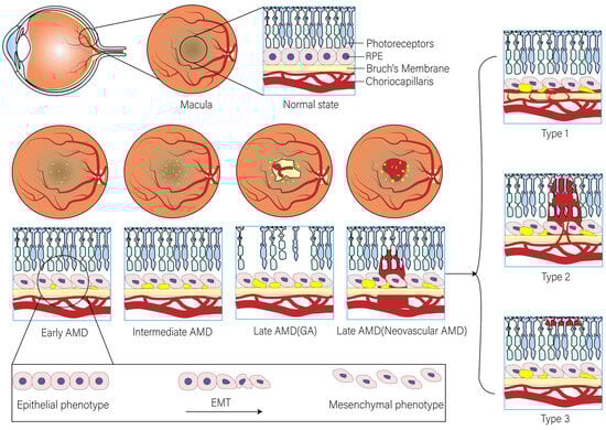 Advanced AMD, including geographic atrophy (GA, also known as dry or non-exudative AMD) or neovascular AMD (nAMD, also known as wet or exudative AMD), can lead to severe and permanent visual impairment [12] (Figure 1). Dry AMD is characterized by an increase in drusen and extracellular deposits, concurrent with a decline in retinal pigment epithelial (RPE) cells, photoreceptors, and choroidal capillaries [13]. Constituting 70–90% of all AMD cases, dry AMD urgently demands clinical intervention, yet effective remedies remain elusive [14]. It has been suggested that in dry AMD, lysosomal dysfunction may drive RPE cells into the EMT in order to survive the stressful microenvironment. New evidence provided by Ghosh et al. suggests that the βA3/A1-crystallin protein encoded by the Cryba1 gene becomes a potential therapeutic target for dry AMD through the restoration of lysosomal dysfunction and the potential reversal of EMT [11]. Thus, this may provide a novel and effective approach to preventing or delaying the progression of AMD, which deserves to be thoroughly investigated in the future. In recent years, with the development of single-cell technology, researchers have gradually recognised that the lack of patient-derived RPE datasets severely limits the in-depth resolution of RPE pathogenesis, especially at the single-cell resolution level. Xu et al. integrated a large number of RNA-seq datasets from dry AMD in order to extract molecular features of RPE in the pathogenesis of dry AMD. It was found that carboxypeptidase X (CPXM2) showed specific high expression in RPE cells from dry AMD patients, and the molecule was confirmed to be involved in regulating the EMT process in RPE cells by ex vivo experiments. Furthermore, the silencing of CPXM2 suppressed the mesenchymal phenotype of RPE cells in an oxidative stress cell model [15]. Thus, this may represent a potential therapeutic direction for dry AMD. In contrast, wet AMD is typified by choroidal neovascular (CNV) membranes, accompanied by typical lesions such as RPE cell detachments or subretinal fibrous scar tissue [16]. CNV is classified into the following types based on anatomical histopathological location: type 1 CNV is located below the RPE; type 2 CNV occurs between the retina and the RPE; and type 3 neovascularisation begins within the retina and then reaches the subretinal or sub-RPE region. The classic CNV in wet AMD is type 2 CNV [17]. Currently, anti-vascular endothelial growth factor (VEGF) therapy is the frontline treatment for CNV [18]. However, a high incidence of subretinal scar formation (fibrosis) post-treatment can precipitate permanent macular visual system dysfunction [19]. Therefore, there is an urgent need to advance our understanding of subretinal fibrosis and its pathogenic mechanisms in order to develop alternative treatment options. A recent study using anti-VEGF drugs, including bevacizumab (Bev), ranibizumab (Ran), and abciximab (Afl), demonstrated that blockade of the VEGF signalling pathway induced EMT in the RPE, accompanied by the induction of CCN2, a potent pro-fibrotic factor. And further studies showed that co-treatment with CCN5, an anti-fibrotic factor that downregulates CCN2 expression, prevented this adverse effect. Based on the results of this study, the researchers suggest that co-administration of anti-VEGF drugs with CCN5 would be safer. This study lays the groundwork for the development of a highly effective and safer treatment for nAMD [20].