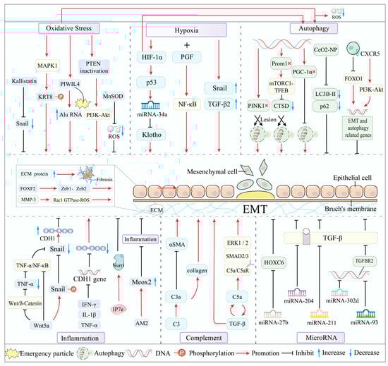 EMT is a reversible, multi-step process influenced by oxidative stress, hypoxia, autophagy, inflammation, and complement activation [141]. These mechanisms interact intricately; for example, hypoxia induces autophagy, while oxidative stress stimulates autophagy to mitigate ROS damage [42]. Hypoxia-induced HIF-1α further regulates autophagy and mitophagy, highlighting the interconnectedness of these pathways [142]. In the future, investigating the crosstalk between signaling pathways that regulate RPE-EMT will contribute to the development of novel therapies for AMD.