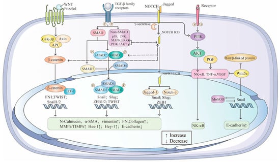 TGF-β, a member of the growth factor superfamily, is a tightly regulated signaling molecule with complex transcriptional and translational processes. The TGF-β/SMAD pathway [86] is the primary signaling cascade driving EMT in RPE cells, alongside the Wnt/β-catenin [61] and Jagged/Notch [87] pathways. Extensive crosstalk between these pathways creates a complex regulatory network that significantly impacts AMD progression (Figure 3).