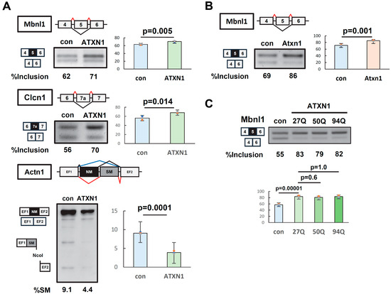ATXN1 regulates alternative splicing of minigenes. (A) Splicing assay of human ATXN1 with a normal polyglutamine tract (27Q) in N2a cells using Mbnl1, Clcn1, and Actn1 minigenes. Splice products were detected using reverse transcription–polymerase chain reaction and electrophoresis on either a 2.5% agarose gel or a 12% polyacrylamide gel. To distinguish between the insertion of the NM exon and the SM exon in Actn1, the PCR product was digested with NcoI. Black and grey squares indicate alternative exons. (B) Splicing assay of mouse Atxn1, conducted as in (A). (C) Splicing assay of human ATXN1 with normal (27Q) and expanded (50Q and 94Q) polyglutamine in N2a cells using the Mbnl1 minigene. In (A–C), bar charts indicate the fraction of exon inclusion (Mbnl1 and Clcn1) or the inclusion of the smooth muscle (SM) exon (Actn1). Error bars represent the mean ± SD (n = 3); a two-tailed Welch’s t-test was used for (A,B), while Tukey’s test was applied for (C). The original images of gel can be found in the Supplementary Materials.