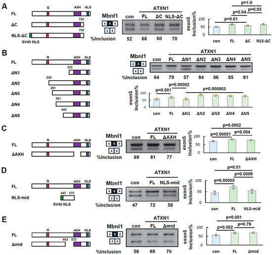 The AXH domain has been reported to interact with itself, other proteins, and RNA [11,18,28]. However, as shown above, the ΔN1 mutant, which retains both the AXH domain and the C-terminal NLS, did not exhibit splicing regulatory activity (Figure 3B), indicating that these domains alone are insufficient for this function. To further investigate the role of the AXH domain, we examined the ΔAXH mutant in a splicing assay (Figure 3C). Splicing assays demonstrated that ΔAXH exhibited an intermediate inclusion rate of Mbnl1 exon 5 between that of FL and the control, suggesting that the AXH domain plays a partial role in ATXN1’s splicing regulatory function.