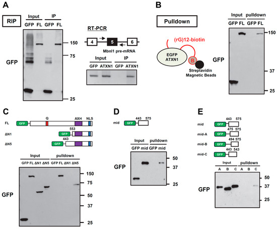 RNA binding of ATXN1 and its deletion mutants. (A) Ribonucleoprotein immunoprecipitation (RIP) analysis of ATXN1. EGFP (con) and EGFP-ATXN1 were introduced into Neuro2a cells. After paraformaldehyde fixation, proteins were immunoprecipitated using an anti-GFP antibody. The left panel shows Western blot results of the immunoprecipitation. The right panel shows Mbnl1 pre-mRNA detected by RT-PCR using RNA retrieved from the immunoprecipitates. (B) RNA pulldown assay of full-length ATXN1. EGFP or EGFP-ATXN1 was transfected into N2a cells. The cell lysates were subjected to RNA pulldown assay using biotinylated poly(rG) RNA (12-mer of guanosine) bound to streptavidin-coated magnetic beads. Input and pulldown fractions were analyzed by Western blot using an anti-GFP antibody. (C) RNA pulldown assay of ATXN1 N-terminal deletion mutants (ΔN1 and ΔN5), conducted as in (B). (D) RNA pulldown assay of the middle region of ATXN1. The mid mutant was analyzed using the RNA pulldown assay, conducted as in (B). (E) RNA pulldown assay of the middle region of ATXN1. We examined truncated mutants shorter than the mid variant using an RNA pull-down assay, conducted as in (B). The original images of gel can be found in the Supplementary Materials.
