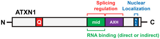 Spinocerebellar ataxia type 1 (SCA1) is an autosomal dominant disorder characterized by degeneration of the cerebellum, brainstem, and spinal cord, caused by mutations in the ATXN1 (Ataxin-1) gene [1]. ATXN1 contains a polyglutamine (polyQ) tract encoded by a CAG repeat sequence, which normally ranges from 14 to 34 repeats but is expanded to 39 or more in SCA1 [2]. ATXN1 is a transcriptional regulator highly expressed in neurons. Expansion of the polyglutamine tract alters ATXN1’s protein–protein interactions and leads to the formation of nuclear inclusions. Knockout mice for Atxn1 do not exhibit significant neurodegeneration, whereas transgenic and knock-in mice expressing mutant ATXN1 recapitulate SCA1-associated neuronal degeneration [3,4,5]. Thus, the primary pathogenic mechanism of SCA1 is thought to be the toxic gain of function of mutant ATXN1. However, the loss of normal ATXN1 function has also been suggested to contribute to SCA1 pathogenesis [6]. In addition to SCA1, ATXN1 has been implicated in various neurological disorders, such as Alzheimer’s disease [7] and multiple sclerosis [8], as well as in cancer [9,10]. Therefore, understanding its molecular properties is critical within the context of a broad range of diseases.
