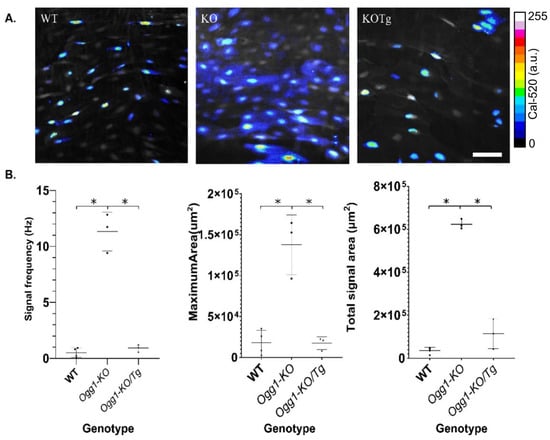 Using the en face technique, carotid artery endothelial calcium activity was measured during a baseline interval, and the signal frequency of the tissue-wide calcium signal transients was analyzed. This analysis included the calculation of the spatial and temporal parameters associated with the calcium signal activity in each measurement interval. Signal frequency was defined as the tissue-wide number of signal transients at distinct cellular sites per second (Hz), reflecting the total amount of calcium activity. Analysis of the area encompassing each calcium signal utilized both the maximum signal area at each cellular signal transient location and the cumulative result of the spatial areas encompassed by all calcium signals within the tissue. These metrics reflect both the size of each individual signal transient, encompassing both subcellular and multicellular activity, and the total area of all calcium activity within the image sequences. Time-lapse summed images revealed striking differences in the calcium signaling phenotype dependent on OGG1 (Figure 1A). Carotids from the OGG1-KO group exhibited an anomalous calcium phenotype characterized by an increase in calcium signal frequency (11.3 ± 1.74 Hz vs. 0.51 ± 0.43 Hz), maximum per site (1.4 × 105 µm2 vs. 1.8 × 104 µm2), and total spatial area (6.2 × 105 µm2 vs. 3.5 × 104 µm2) compared to the results for the controls, respectively (p < 0.0001). Repletion of OGG1 (Ogg1-KO/Tg) rescued the calcium signal phenotype relative to wild type controls (Figure 1B).