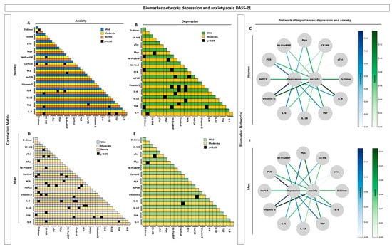 Network of altered interactions among immunological biomarkers in patients with mental disorders. Panels (A,B,D,E) illustrate the relevance of immunological biomarkers through a color-coded correlation matrix analysis (left panels), stratified by symptom severity. For women (A), levels of anxiety—mild (blue), moderate (yellow), and severe (orange)—are represented in dark shades; for men (D), in light shades. Regarding depression, women (B) are shown in dark shades for mild (green) and moderate (yellow) levels, while men (E) are represented in light shades. Correlations between biomarkers were considered significant when p < 0.05 and are highlighted in black. Panels (C,F) display the biomarker interaction networks built using the Random Forest algorithm. Each node represents a biomarker, including D-dimer, vitamin D, cortisol, NT-proBNP, myoglobin (Myo), CK-MB, troponin I (cTnI), IL-6, IL-1β, TNF, and IL-8. The strength of the connections (green and/or blue) is indicated by the thickness and color of the lines: blue for depression and green for anxiety. The connections for depression and anxiety were assessed on a scale from 0 to 14%, where 0 represents no connection and 14% a strong connection. All analyses were conducted on 96 male and female volunteers who completed an adapted version of the DASS-21 questionnaire to assess symptoms of depression and anxiety.