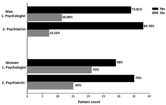 Number of patients who have or have not been seen by a psychologist and/or psychiatrist according to self-report. The figure presents a graph comparing the frequency of men and women who consulted a psychologist and/or psychiatrist. Data are expressed as percentages based on the patient count. Responses are divided into “Yes”, represented by black bars, and “No”, represented by gray bars. The horizontal axis shows the patient count (from 0 to 40), and the vertical axis organizes the categories by gender (men and women), with numbered subdivisions for psychologists (1) and psychiatrists (2).