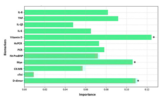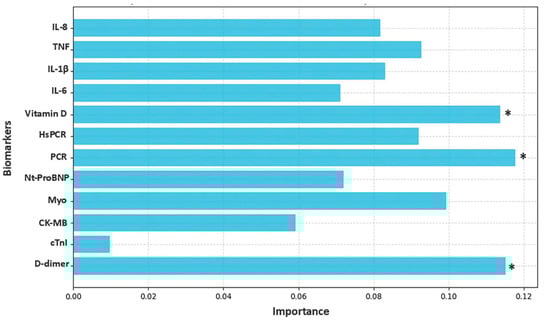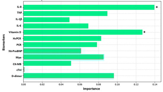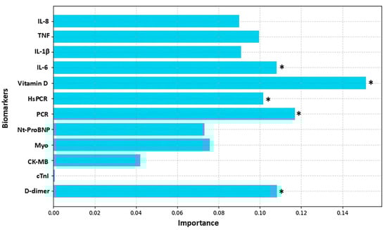 Analysis of biomarker behavior in depression among the male group. The figure shows the relative importance of various biomarkers in the analysis of a predictive model, where the Y-axis lists the evaluated biomarkers and the X-axis represents the degree of importance assigned to each one. The bars, shown in light blue, indicate the contribution of each biomarker to the model’s performance, highlighting those with greater relevance. The biomarkers analyzed include IL-8, TNF, IL-1β, IL-6, vitamin D, HsCRP (high-sensitivity C-reactive protein), CRP (C-reactive protein), NT-ProBNP (N-terminal pro B-type natriuretic peptide), Myo (myoglobin), CK-MB (creatine kinase MB), cTnI (cardiac troponin I), and D-dimer. The X-axis scale ranges approximately from 0.00 to 0.12%, reflecting the magnitude of importance attributed to each biomarker. An asterisk (*) indicates biomarkers that exceeded the 10% importance threshold.