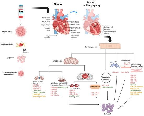 Currently, DOX-induced irreversible cardiac injury and heart failure remain a major obstacle for the clinical application of DOX in cancer therapy. Within the recent decade, accumulated evidence indicates that ncRNAs can regulate various aspects of DIC, including apoptosis, mitochondrial dysregulation, oxidative stress, DNA damage, autophagy, ferroptosis, pyroptosis, and ER stress. These ncRNA-mediated regulations occur at different gene expression levels including transcription, post-transcription, and translation.
