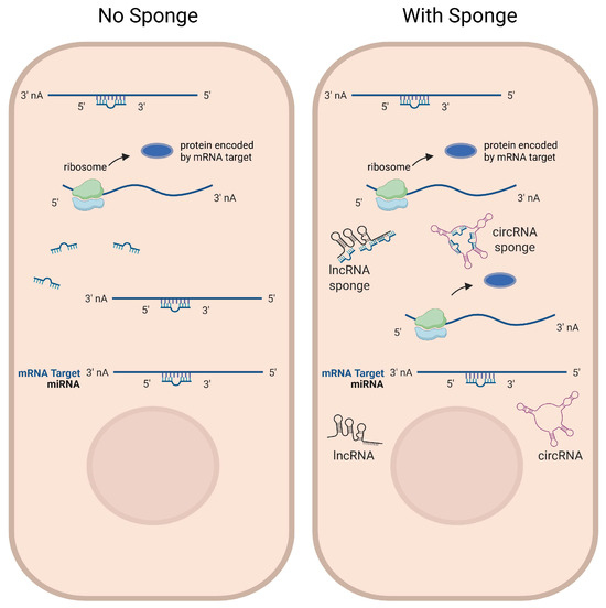 Figure 2. LncRNAs and circRNAs function as miRNA sponges. Some lncRNAs and circRNAs contain multiple binding sites for miRNAs to function as miRNA sponges, which compete with miRNA-targeted mRNAs for miRNA binding. Left: in the absence of sponge RNA expression, target mRNAs are post-transcriptionally repressed by the miRNA. Right: in the presence of sponge RNA expression, target mRNAs are less repressed by miRNAs, potentially leading to increased expression levels of target genes. Figure is created in Biorender (https://BioRender.com) by M.S. (2025).