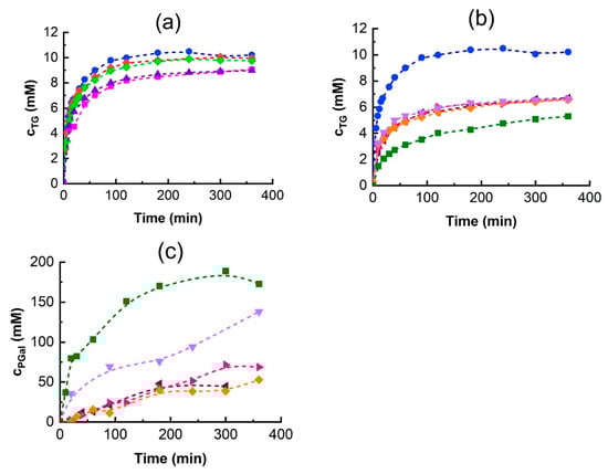In transglycosylation reactions, product accumulation typically declines after reaching a maximum due to the increasing rate of hydrolysis surpassing the formation rate. Interestingly, in TG synthesis using β-galactosidase from A. oryzae, the TG concentration plateaued and remained unchanged over the experimental time (Figure 5a,b). One possible explanation is enzyme inhibition or inactivation. To determine whether the enzyme remained active, glucose release was monitored (Figure 5d,e). Generally, the glucose concentration increased over time, with its release rate being highest at the beginning of the reaction and then gradually decreasing, indicating that the enzyme was still active.