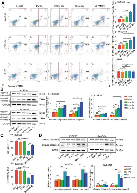 Bru activated caspase-dependent apoptosis in ESCC cells. KYSE30, KYSE450, and SHEE cells were exposed to various dosages of Bru (20, 40, 80 nM) for 24 h. (A) flow cytometry was employed to examine the apoptosis. (B) Protein levels of cleaved caspase-9 and c-caspase-3 were determined by WB assay. ESCC cells were treated by Z-VAD, Bru, and Z-VAD + Bru for 48 h. (C) CCK-8 assay was employed to measure cell viability. (D) Expression levels of c-caspase-9 and c-caspase-3 were examined by WB assay. For (B,D), the protein bands were quantified using ImageJ software. The data are presented as means ± SEM (n = 3). * p < 0.05, ** p < 0.01, *** p < 0.001 vs. DMSO group. # p < 0.05, ## p < 0.01, ### p < 0.001 vs. Bru group. ns, no significance.