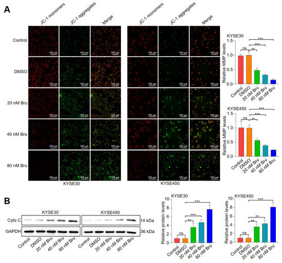 The mitochondrial specific caspase-9 was activated following Bru treatment, suggesting that Bru could induce mitochondrial dysfunction to trigger ESCC cells’ apoptosis. MMP loss and mitochondrial Cyto C release are key indicators of mitochondrial dysfunction. Thus, mitochondrial membrane depolarization and the level of Cyto C in the cytosol were measured using the JC-1 fluorescent probe and WB analysis, respectively. Figure 2A indicated that Bru treatment dramatically reduced the MMP in a dosage-dependent manner, with reductions of approximately 52%, 68%, and 86% in KYSE30 cells and 44%, 62%, and 77% in KYSE450 cells as the concentration increased. Furthermore, Bru administration resulted in a marked increase in cytosolic Cyto C level in a concentration-dependent manner, with increases of approximately 3.6-, 4.6-, and 7.7-fold in KYSE30 cells and 3.6-, 4.4-, and 8.2-fold in KYSE450 cells (Figure 2B). Collectively, the above findings showed that Bru triggered cellular apoptosis through affecting mitochondrial events in ESCC cells.