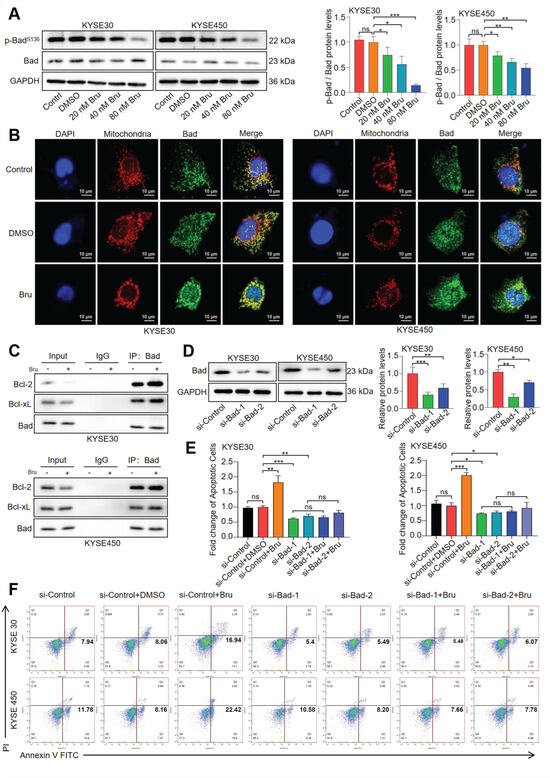 Bru-triggered apoptosis depended on the dephosphorylation of Bad in ESCC cells. (A) KYSE30 and KYSE450 cells were incubated with Bru (20–80 nM) for 24 h; the levels of pBad-S136 and Bad were analyzed by WB assay and quantified using ImageJ software. The results are presented as means ± SEM (n = 3). * p < 0.05, ** p < 0.01, *** p < 0.001 vs. DMSO group. ns, no significance (p > 0.05). (B) Bru-treated ESCC cells were examined for the mitochondrial localization of Bad by confocal microscopy. Green, red, and blue fluorescence indicate Bad, mitochondria, and nucleus, respectively. (C) WB assay revealed that Bru enhanced Bad binding to Bcl-2 or Bcl-xL. (D) ESCC cells were transfected with Bad siRNA; the levels of Bad were determined by WB assay and quantified using ImageJ software. The results are presented as means ± SEM (n = 3). * p < 0.05, ** p < 0.01, *** p < 0.001 vs. si-Control group. (E,F) Flow cytometry was employed to examine the apoptosis in treated ESCC cells and quantified using FlowJo software. The results are presented as means ± SEM (n = 3). * p < 0.05, ** p < 0.01, *** p < 0.001 vs. si-Control + DMSO group. ns, no significance (p > 0.05).