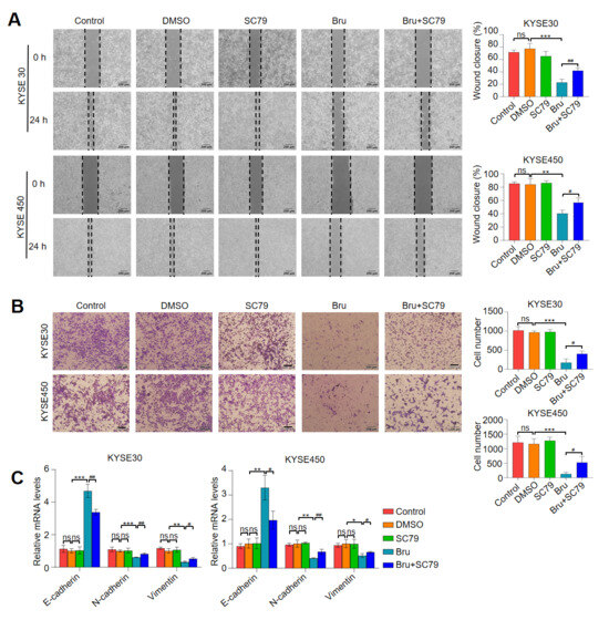 KYSE30 and KYSE450 cells were cultured in 6-well plates to assess cell motility. The cells scratched with a germ-free 10 µL pipette tip were cultured for 24 h, with 20, 40, and 80 nM Bru treatment or combined 80 nM Bru with 11 µM SC79, to evaluate the extent of the wound healing. The wound closure areas were visualized under inverted microscope (Axiovert 25, Carl Zeiss, Jena, Germany) at the same location at 0 or 24 h. The relative distance of the borders was measured with ImageJ software (National Institutes of Health, Bethesda, MD, USA).