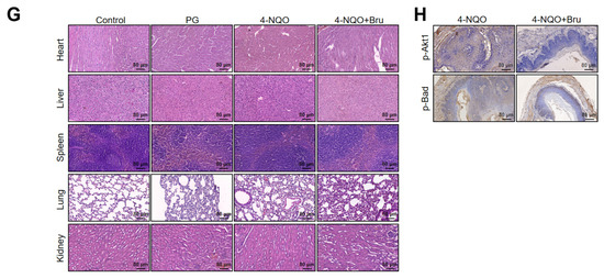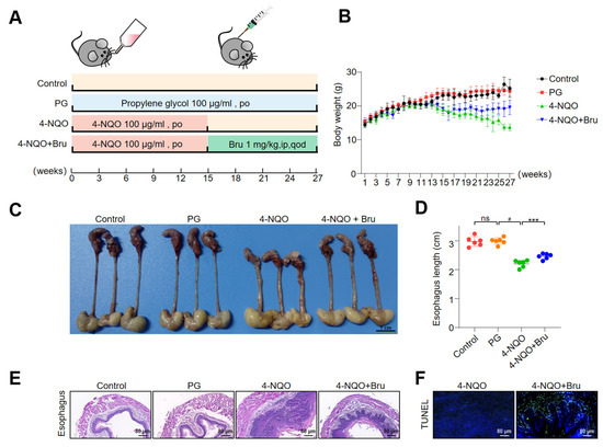 Ethical consent and experimental procedures were approved by the Anhui Medical University Laboratory Animal Centre (ethical approval code: LLSC20210774). Female C57BL/6 mice (4–5 weeks old, n = 6 group, Gem Pharmatech, Nanjing, China) were randomly allocated to four groups. The normal group and solvent control group (PG group) received water and water containing propylene glycol (100 μg/mL) starting from the first week. The 4-NQO group was treated with 4-NQO (100 μg/mL) from the first to the fifteenth week, and then treated with water from the 15th week. The Bru group were given water containing 4-NQO (100 μg/mL) from the first to the fifteenth week, and then administered Bru (1 mg/kg) via intraperitoneal injection three times a week starting at the fifteenth week. Body weight changes were monitored weekly. At the twenty-seventh week, the mice were euthanized using pentobarbital, and the whole esophageal tissues of mice in each group were fixed, and embedded for Hematoxylin and eosin (H&E) staining to detect the ESCC induction, Immunohistochemistry (IHC) to examine the level of p-Akt1 and p-Bad, and terminal deoxynucleotidyl transferase-mediated nick end labeling (TUNEL) staining to determine the level of cell apoptosis. In addition, the heart, liver, spleen, lung, and kidney were also fixed, and embedded for H&E staining to test for pathological alterations.