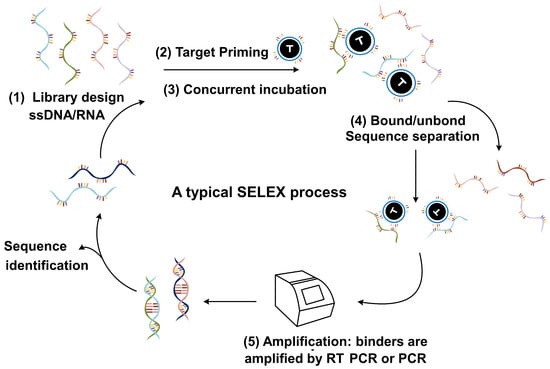 SELEX technology [19], also known as the Systematic Evolution of Ligands by Exponential Enrichment, is a powerful and flexible method for in vitro screening of high-affinity nucleic acid aptamers (Figure 2). The basic principle involves screening oligonucleotide sequences that can bind highly specifically to target molecules. This process is carried out through multiple rounds of in vitro evolutionary cycles from the initial oligonucleotide library. The key steps of this process include the initial oligonucleotide library, binding selection, elution, amplification with the target molecule, and multiple cycles. The initial oligonucleotide library contains a large number of random sequences, which selectively retain the nucleotide sequences bound to the target molecule through reactions. The subsequent elution and PCR amplification steps help increase binding affinity and create more favorable conditions for the next round of selection. This multi-cycle process gradually enriches the specificity and affinity of nucleic acid aptamers, ultimately obtaining nucleic acid aptamers with highly specific binding ability.