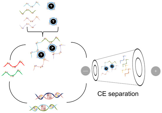 In 2004, capillary electrophoresis (CE) was used for ligand screening using a high-voltage electric field as the propelling force based on differences in component mobility [21] (Figure 3). Compared to the filters and affinity chromatography methods used by early biologists [8,22], CE provides an effective method for separating and collecting complex, high-resolution complexes and unbound single-stranded DNA. CE is not only a separation tool but also an analytical technique that can be used to determine affinity constants and help monitor both the enrichment of single-stranded DNA in each round of selection as well as the purity or quality of target substances and single-stranded DNA libraries. As a microanalysis technique, CE has a lower cost and allows for more experiments compared to other methods, using the same amount of reagents and samples. In addition, CE also has multiple separation modes that can be flexibly applied to achieve different functions. Throughout the entire SELEX process, CE plays multiple roles and is widely acknowledged for its exceptional efficacy, being hailed as one of the most effective screening methodologies [23].
