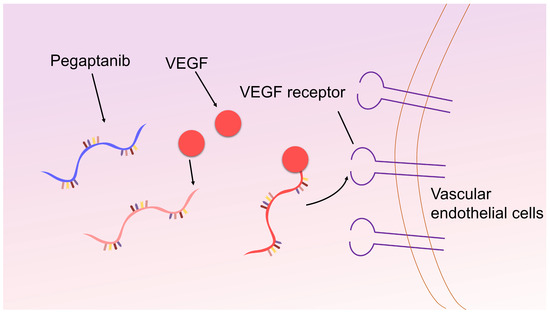 In recent years, there have been significant advancements in the treatment of macular degeneration. Firstly, neovascularization is a pathological process associated with age-related macular degeneration (AMD), the retinopathy of prematurity, and diabetic retinopathy [59,60]. The upregulation of vascular endothelial growth factor (VEGF) is considered a common characteristic in these diseases, thus prompting attention towards VEGF-targeted treatment strategies. Pegaptanib, formerly known as NX-1838 [61], has emerged as a noteworthy aptamer drug in AMD therapy (Figure 5). With a high affinity for VEGF165, pegaptanib effectively inhibits VEGF-mediated capillary leakage by binding to a 40 kDa polyethylene glycol (PEG) molecule, thereby laying the groundwork for intraocular anti-angiogenic therapy. Clinical trial findings have demonstrated the significant efficacy of pegaptanib both as a standalone treatment for AMD patients and in combination with photodynamic therapy. However, the drug is accompanied by certain side effects, including endophthalmitis, elevated intraocular pressure, and rare instances of allergic reactions and similar hypersensitivity reactions [62].