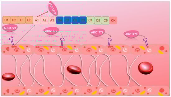 During the blood coagulation process, von Willebrand factor (vWF) becomes exposed on the surface of blood vessels following endothelial injury, facilitating platelet adhesion. ARC1779, a DNA/RNA aptamer consisting of 49 nucleotides, selectively binds to the A1 domain of vWF, disrupting the interaction between vWF and the platelet receptor GPIb (Figure 6). Consequently, this inhibits platelet activation and mitigates the potential for pathological thrombosis [75,76]. ARC1779 exhibits promising therapeutic potential in the treatment of von Willebrand disease and acute coronary syndrome [77].