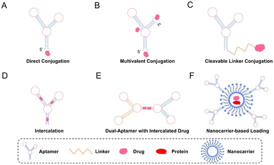 Figure 7. Examples of ApDC from covalent and noncovalent conjugation. (A) The drug is covalently attached directly to the aptamer without a linker, typically at the 5′ or 3′ end. (B) Multiple drug molecules are covalently attached to different sites of the same aptamer, enhancing therapeutic potency or enabling combination therapy. (C) A cleavable linker connects the drug to the aptamer, enabling triggered drug release under specific conditions (e.g., acidic pH, redox environment, or enzymatic cleavage). (D) The drug is noncovalently inserted between nucleobases of the aptamer via π–π stacking interactions, commonly observed with intercalating agents like doxorubicin. (E) Two aptamers are linked by a DNA duplex that noncovalently accommodates drug molecules. (F) The aptamer is noncovalently attached to the surface of a drug-loaded nanocarrier (e.g., liposome, polymeric nanoparticle, gold nanoparticle), serving as a targeting ligand for enhanced drug delivery.