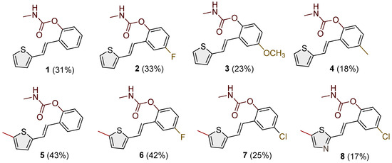 Heterostilbene carbamates 1–19 were purified by column chromatography using petroleum ether and diethyl ether in different ratios as the eluent and isolated with a broad range of yields, primarily depending on the carbamoyl chlorides used and on the nature and position of the substituents (13–93%, Figure 2 and Figure 3). When comparing the isolated yields of methyl carbamates 1–8 (Figure 2) and ethyl-methyl carbamates 9–19 (Figure 3), it is obvious that the isolated yields for some derivatives in the second group are very high in some cases (compounds 11, 16, and 19). It can be noticed that within certain groups of carbamates (derivatives 1–8 or 9–19), the nature of the heterocyclic nuclei, the substituent on it, and the carbamate group’s position affect each carbamate’s isolated yield.