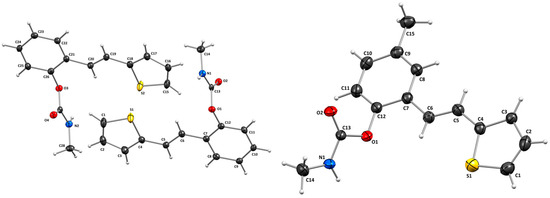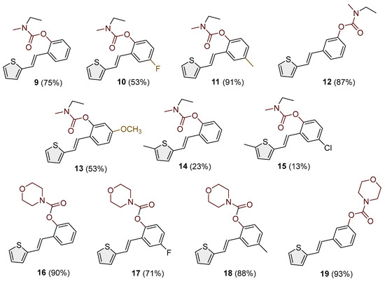 For carbamates 9–19, the highest yields were achieved with heterostilbene carbamates 11, 12, 16, 18, and 19 (Figure 3, 87–93%), which, besides the carbamoyl group, either lack additional substituents on the aromatic nucleus or contain only a methyl group, with the thiophene ring remaining unsubstituted in all cases. It should also be emphasized that all four derivatives with a morpholine carbamate group (16–19) gave high yields. The presence of a methyl substituent on the thiophene ring is not favorable for synthesis regarding the isolated yields of the carbamate products (compounds 14 and 15).