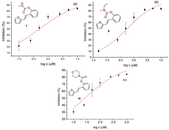 Dose–response curve for the inhibition of BChE by 1 (a), 9 (b), and 16 (c).