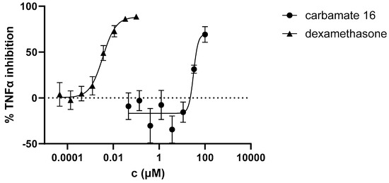 The potential anti-inflammatory activity of compounds was evaluated in vitro in an assay where PBMCs were stimulated with LPS to induce TNFα production. Of all the tested compounds, only carbamate 16 inhibited LPS-stimulated TNFα production (Figure 7). The compound was active at the two highest concentrations tested, with an average IC50 of 31.6 µM in PBMCs from two donors. Dexamethasone, a corticosteroid widely used to treat inflammatory conditions, was used in this assay as a reference compound. As expected, it was highly effective in inhibiting LPS-stimulated TNFα production with an IC50 value of 3.5 nM, which aligns with results obtained previously in this assay [27].