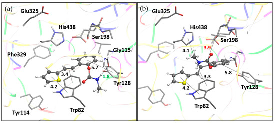 Molecule 1 docked into the active site of BChE. (a) Structure of the most stable complex, BChE-1(I), with the hydrogen bond length indicated in green. (b) Structure BChE-1(II) with the ligand pose from the most populated cluster; distance to serine hydroxyl oxygen marked in red. Docked molecules are presented using a ball-and-stick model, with distances given in angstroms.