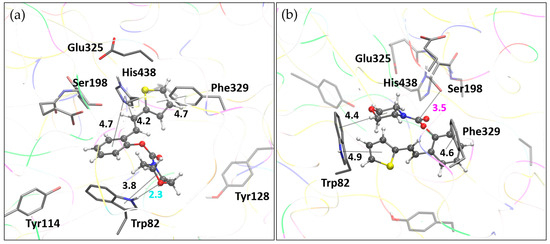 Molecule 16 docked into the active site of BChE. (a) Structure of the most stable complex, BChE-16(I), with the hydrogen bond length marked in cyan. (b) Structure BChE-1(II) with the ligand pose from the most populated cluster; distance to serine hydroxyl oxygen marked in magenta. Docked molecules are presented using a ball-and-stick model. Distances given in angstroms.
