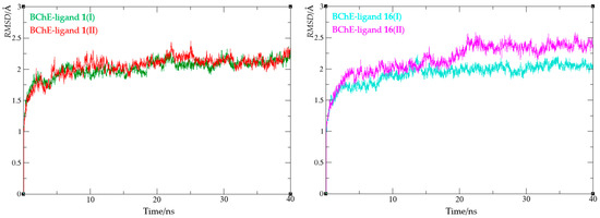 Root mean square deviation values from molecular dynamics simulations of enzyme–ligand complexes of BChE with compound 1 (left) and compound 16 (right).