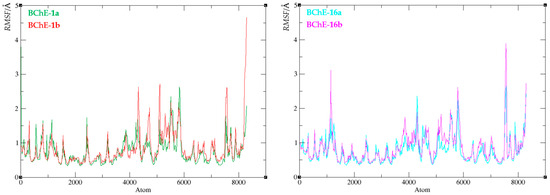 Root mean square fluctuation values of the enzyme–ligand complexes of BChE with compound 1 (left) and compound 16 (right).