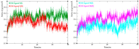 Values of the radius of gyration from molecular dynamics simulation of enzyme-ligand complexes of BChE with compounds 1 (left) and 16 (right).