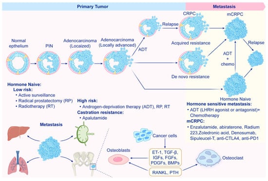 The progression of prostate cancer leads to the development of metastatic castration-resistant prostate cancer (mCRPC). The diagnosis of prostatic intraepithelial neoplasia (PIN) is characterized by the proliferation of luminal cells alongside dysplasia within the ducts. PIN has the potential to progress to localized prostate adenocarcinoma, which can then develop into locally invasive carcinoma when the basal cell layer is compromised, allowing cancer cells to invade the basal lamina. Once locally advanced, prostate cancer typically metastasizes first to the draining lymph nodes and later to distant sites, primarily the bones, liver and lungs, with bone being the most common metastatic site. In cases of bone metastasis, there is a dynamic interaction among cancer cells, osteoblasts and osteoclasts, creating a “vicious cycle” of bone formation and destruction that ultimately promotes cancer cell survival and tumor progression. Androgen receptor (AR)-dependent localized advanced prostate adenocarcinoma initially responds to androgen deprivation therapy (ADT) but may progress to castration-resistant prostate cancer (CRPC). Some localized advanced cases can show de novo resistance to ADT. Similarly, AR-dependent hormone-naïve metastatic tumors often respond to ADT at first but can evolve into metastatic CRPC, while AR-indifferent hormone-naïve metastatic tumors may exhibit de novo resistance. Treatment strategies for prostate cancer are guided by the tumor stage and the patient’s prior therapies, requiring a personalized approach to management as the disease progresses.