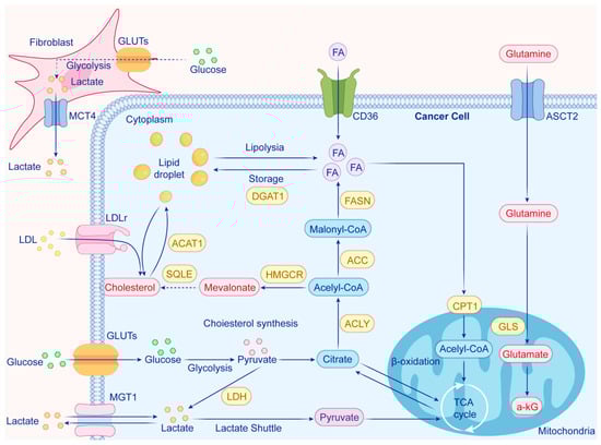 In advanced prostate cancer (PCa), cancer cells undergo significant metabolic changes to meet their increased energy and proliferation demands. Key features include the following: 1. Increased Glucose Uptake: PCa cells overexpress glucose transporters (GLUTs), leading to enhanced glycolysis and lactate production via lactate dehydrogenase (LDH). Lactate is exported through monocarboxylate transporters (MCTs) and can be taken up again by cancer cells to fuel the tricarboxylic acid (TCA) cycle. 2. Glutamine Utilization: Glutamine is transported into cells via ASCT2, converted to glutamate by glutaminase (GLS), and then transformed into α-ketoglutarate, entering the TCA cycle. 3. Fatty Acid Metabolism: Fatty acids are taken up through the CD36 transporter and undergo β-oxidation in mitochondria to produce acetyl-CoA, which fuels the TCA cycle. Excess fatty acids can be stored as lipid droplets or undergo lipolysis. 4. Cholesterol Biosynthesis: Cholesterol is synthesized from acetyl-CoA via the mevalonate pathway, involving enzymes such as HMGCR and SQLE, and can be stored in lipid droplets or internalized from low-density lipoprotein (LDL). This metabolic reprogramming enables PCa cells to adapt and thrive, highlighting potential therapeutic targets in these pathways.