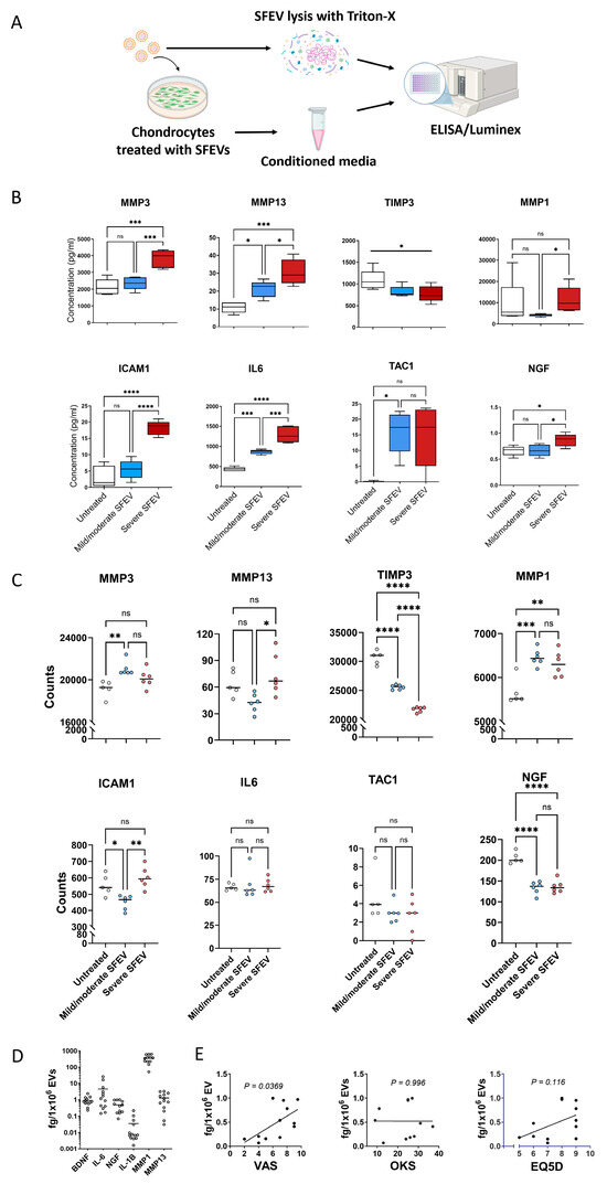 3.5. Synovial Fluid EVs from Patients with Severe OA Induce the Differential Release of Catabolic and Inflammatory Mediators in Human Articular Chondrocytes
