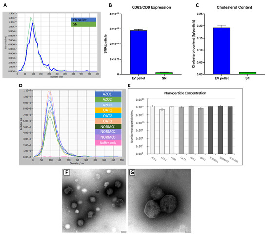 Characterization of EVs isolated by EV-GAG-based protocol from seminal fluids. The assessment of EV content was first performed on three proband samples from three NORMO subjects (A–C); (A) NTA-estimated particle size distributions, (B) cholesterol content (expressed in fg per particle), (C) tetraspanin CD63/CD9 expression, expressed as signal-to-noise ratio (SNR). EV-pellet indicates pellet obtained by EV-GAG-mediated precipitation from seminal fluid, and SN- indicates post-precipitation supernatant. (D,E) NTA was used to compare the size and concentration of particles isolated from normozoospermic (NORMO), oligoasthenoteratozoospermic (OAT), and azoospermic (AZO) subjects. (F,G) Ultrastructural characterization of EVs from NORMO samples by TEM.